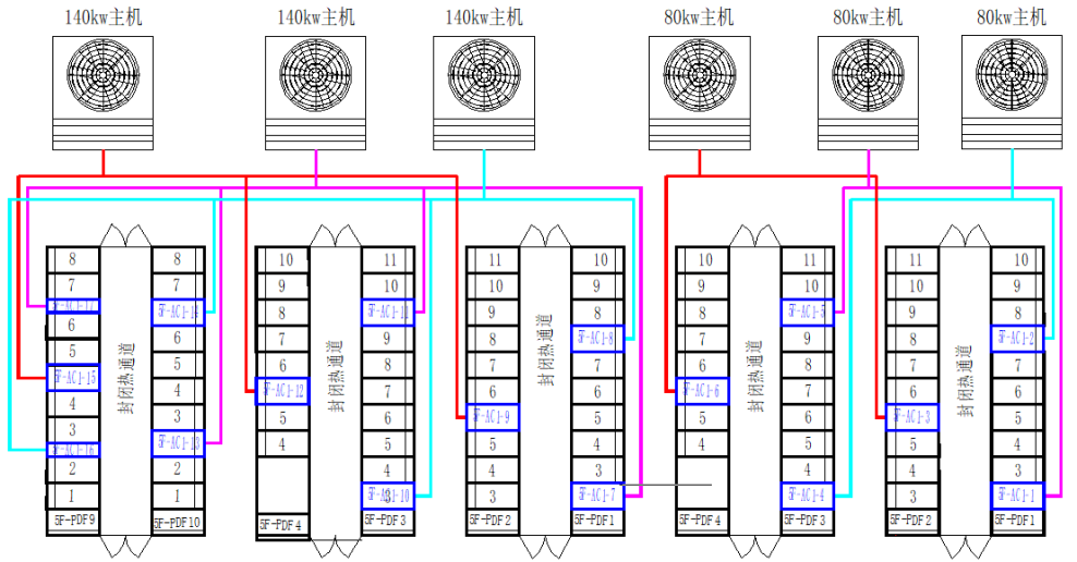 一对一直连系统:针对规模较小的中小型数据机房,室外蒸发冷氟泵主机和室内末端一一对应。室外应用场景不受限制,楼顶、地面、阳台均可以安装。室内末端不受限制,可以是房间级、列间、背板和风墙等。
