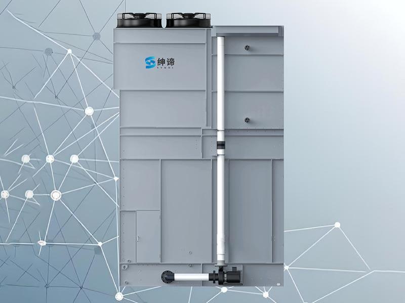 蒸发冷氟泵主机为一体化塔式结构,集成了蒸发冷和氟泵技术。采用两级蒸发冷却,即盘管喷淋蒸发以及填料区冷却水二次蒸发冷却。冷却水直接喷淋在高温冷凝器表面,冷却水吸热后温度急剧升高,部分冷却水汽化形成水蒸汽,蒸发带走大量的热量,热风由风机排入大气。盘管内的高温气态制冷剂与降温后的盘管进行热交换,制冷剂放热由气态冷凝成液态。与此同时,与盘管热交换升温后的冷却水,在重力的作用下向下流动,在填料区与机组吸进的低温空气进行二次蒸发冷却,冷却后储存于底部集水池中循环使用,大幅降低水的消耗量。更低的冷却水温度,循环蒸发时可带走更多的热量,更节能节水。